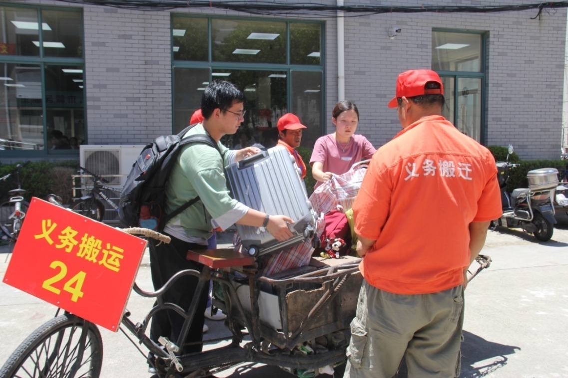 中午的徐汇处于烈日曝晒之下,到达徐汇后,同学们在义务搬迁的志愿者们的积极协助下,很快地完成了行李的卸货与运输。