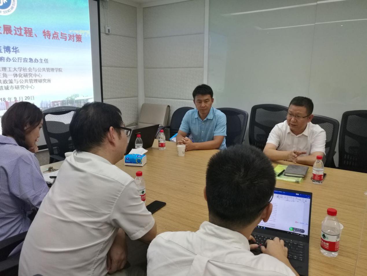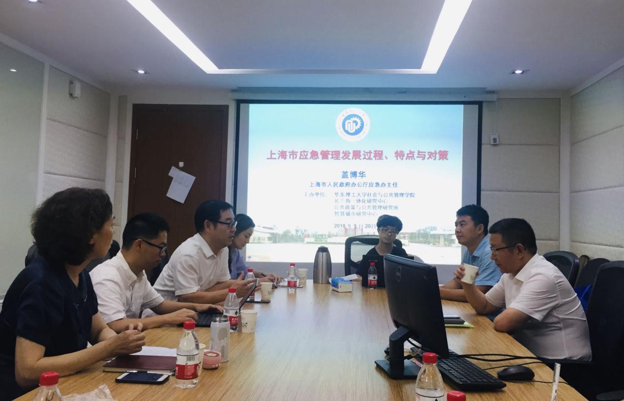 2018年9月20日下午,英国365官网长三角一体化研究中心、公共政策与公共管理研究所以及信息学院智慧城市研究中心联合举办的长三角一体化系列高层论坛第七讲在华东理工大学社会与英国正版365官方网站318会议室顺利举行。本次论坛邀请了上海市人民政府办公厅应急办主任盖博华做题为“上海市应急管理主要经验与对策”的主题报告。英国365官网长三角一体化研究中心主任纪晓岚教授、人文社科处副处长唐有财教授、公共政策与公共管理研究所所长罗建平教授,信息科学与工程学院智慧城市研究中心主任赵文瑜教授,长三角一体化研究中心团队全体成员及博士、研究生参加了会议,会议由纪晓岚教授主持。