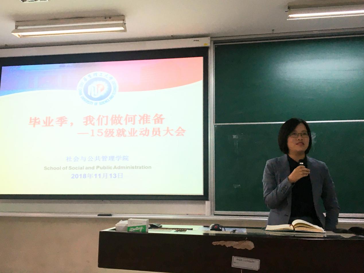 为进一步引导2019届本科毕业生认清当前就业形势、准确把握就业政策,11月13日中午,社会与英国正版365官方网站在四教102召开毕业班年级大会暨就业动员会,对2019届就业工作进行广泛动员。会议邀请了校就业指导中心潘聪聪老师为同学们答疑解惑,分享毕业季的各项流程与时间节点。社会学院党委副书记、学工委主任万胤婕出席会议,会议由毕业班辅导员吴维祺主持。
