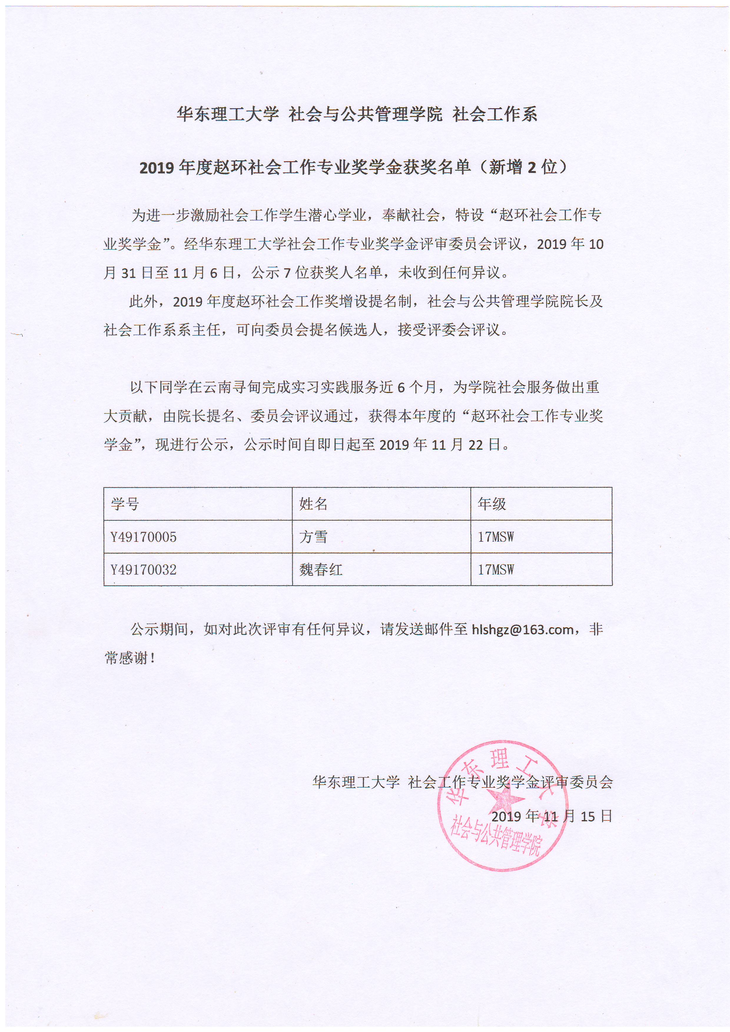 2019年度赵环社会工作专业奖学金获奖名单公示(新增2位)