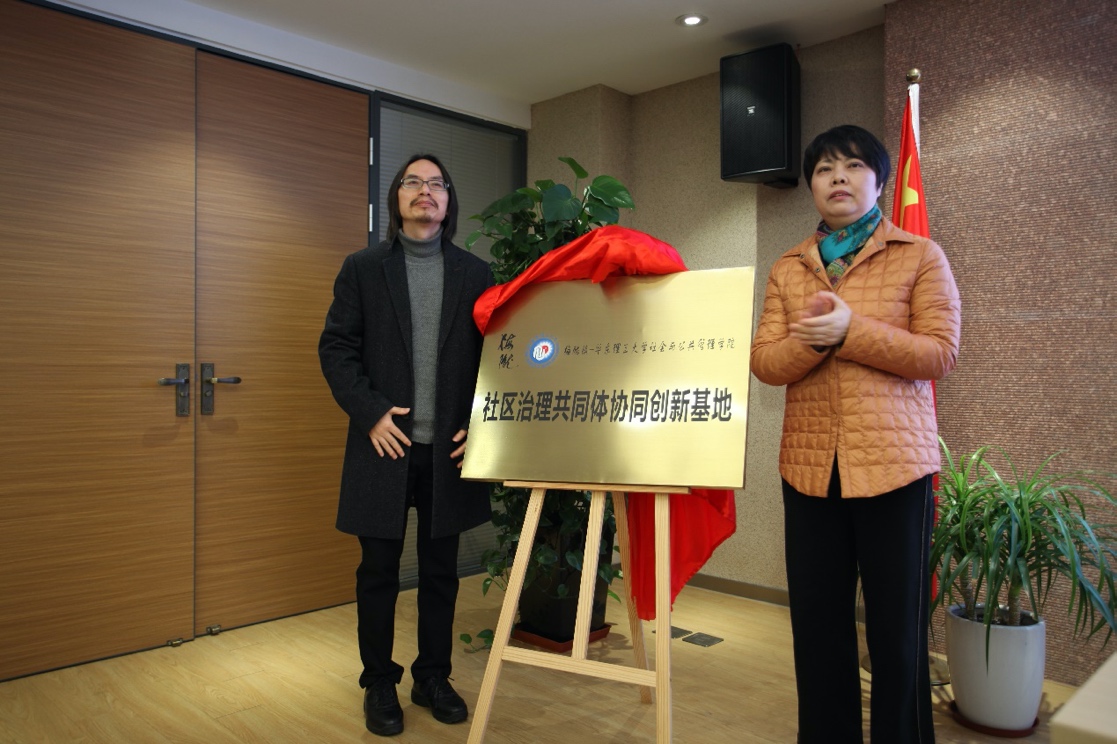何雪松院长在讲话中指出,高校与社区携手建立创新基地,可以起到推进社区发展、促进高校科研的双赢目的,华东理工大学社会学院在社区治理方面具有较为成熟的理论和实践经验,将与社区联手,推进社区治理共同体的建设,并在快速城市化时局下共同讲好梅陇故事。梅陇镇党委副书记管燕为梅陇镇社区骨干培训作开班动员,她表示,基地建设会进一步提升梅陇镇社区治理能级,提高社区治理效能,希望社区干部以此为契机进一步培养责任意识与创新能力,增强使命感,切实通过培训收获知识与技能。管燕与何雪松共同为协同创新基地揭牌。