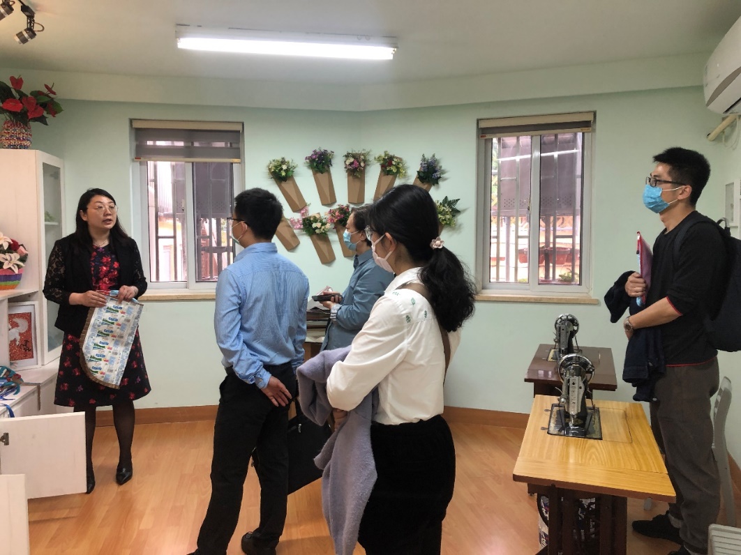 上午,梅陇三村居委会陈新垠书记在绿主妇展示厅讲解了社区发展历程并介绍了疫情期间社区党员志愿者积极参与防疫抗疫的感人事迹,课题组还参观了绿主妇手工艺产品展示室、爱心编织社、一平米菜园、社区康复室等。陈书记带领调研人员实地参观了社区新基建项目:快递自提柜、蔬果冷鲜柜、社区微菜场、无人超市、带胚芽大米自动加工售货机、专人管理的电动车充电室等。随后,调研人员一行来到尚艳华书记工作室,针对本次疫情防控常态化条件下社区“新基建”需求情况开展了调研访谈,访谈议题内容主要有:便民设施新增情况、设施使用情况、居民使用体验、设施相关建设、疫情防控建议等五大方面。座谈会上,尚艳华书记以小区新建的无人超市使用为例,建议社区新基建项目要根据不同群体居民的需求,尤其要考虑社区居家的空巢老人及各类弱势群体的需求,各类电子产品和智能化产品要简单易学,不能过于繁琐和复杂。要构建疫情防控常态化下适合基层的有效运行机制。要从居民的实际需要出发,不能脱离实际,一轰而上,避免造成设备闲置和资金浪费。