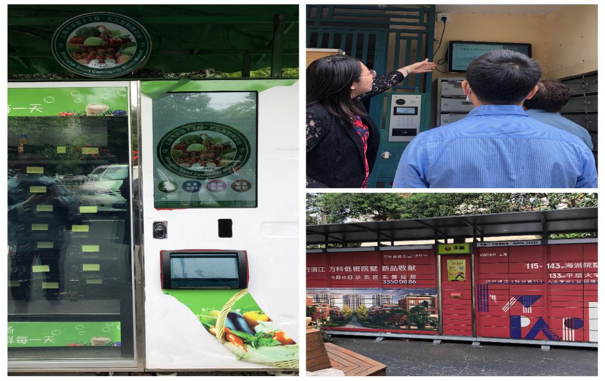 最后,调研人员一行实地参观了梅陇三村“新基建”设施,包括运用人工智能和物联网技术的智能自提快递柜、无人超市、智能人脸识别系统、大米自动售货机、微菜场系统等,这些设施都在本次疫情防控中发挥了很大作用。