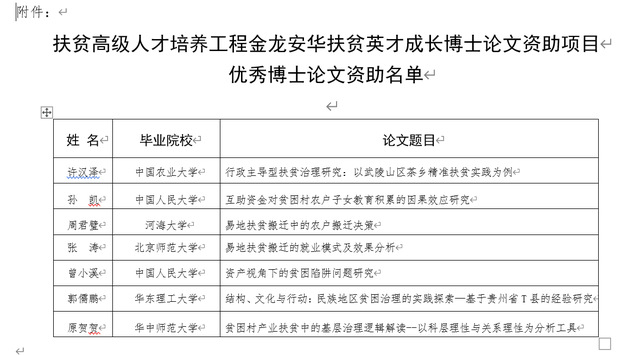 近日,英国365官网2019届毕业研究生郭儒鹏的博士论文《结构、文化与行动:民族地区贫困治理的实践探索——基于贵州省T县的经验研究》(指导教师:杨发祥教授)获得国务院扶贫办“扶贫高级人才培养工程:金龙安华扶贫英才成长博士论文项目”资助。