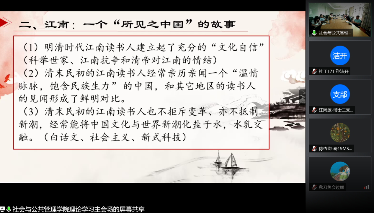 瞿骏教授以“五四时期的北京、上海双塔”、“江南:一个‘所见之中国’的故事”、“红色文化:五四运动成果再审视”、“中国革命的‘江南特征’”四个篇章讲述了五四运动的内涵与意义、五四运动与江南红色文化形成的历史,主题鲜明,内容丰富,讲述生动,深入浅出,引导广大师生坚定政治信仰,厚植爱国情怀,践行初心使命。