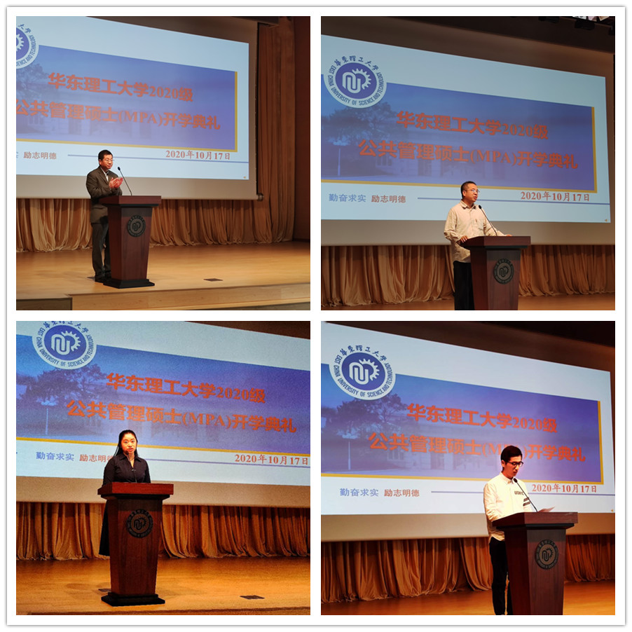 黄时进教授鼓励各位学生要勤学习、勤思考、勤联系,培养卓越的观察力、想象力、判断力和鉴赏力;老生代表陆梦怡同学表达了对于新同学们的欢迎;新生代表臧臣同学说,能够进入华东理工大学继续深造,内心充满喜悦;入学后将按照学校的各项规定和要求,努力学习、争取佳绩。