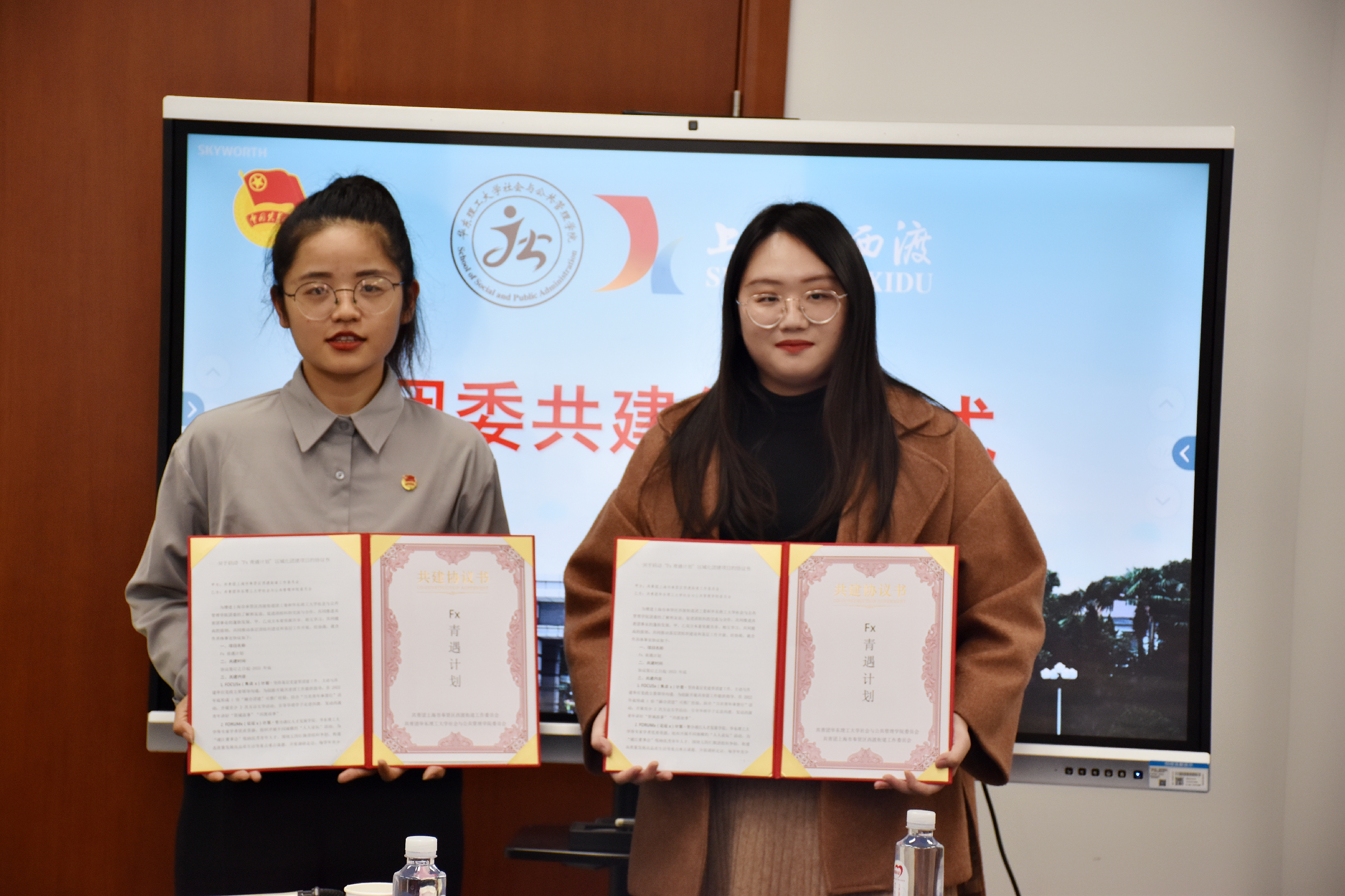 随后,双方对共建协议细则进行商讨,希望通过不断拓宽社院和西渡街道的合作空间,将社院的学科专业优势与西渡街道发展需求相结合,为英国365官网社会实践项目落地提供长期合作平台。把西渡街道“四史”教育优势资源与英国365官网师生的“四史”学习需求相结合,坚定理想信念,切实增强英国365官网师生守初心、担使命的思想自觉和行动自觉。将西渡街道在基础组织建设的优势以及英国365官网在教育培养的需求相结合,为共建工作发展构建新格局、新平台。双方达成了合作共识,姜忱和于薇代表华东理工大学社会与英国正版365官方网站团委与西渡街道团工委签订了共建协议书。共建仪式结束后,英国365官网邀请西渡街道参会人员作为嘉宾参加了英国365官网社会实践大赛。