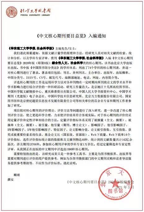 3月8日,《中文核心期刊要目总览》2020版编委会向我校寄送了“入编通知”,《华东理工大学学报》(社会科学版)入编《中文核心期刊要目总览》2020年版(即第9版)综合性人文、社会科学类的核心期刊。该书由北京大学出版社出版,2020年版从全国13764种中文期刊中评选出了74个学科、共计1990种核心期刊。中文核心期刊的评选工作,是运用科学方法对各种刊物在一定时期内所刊载论文的学术水平和学术影响力进行综合评价的一种科研活动。北京大学核心期刊评价项目组采用了被摘量、被摘率、被引量、他引量、影响因子、基金论文比等16个评价指标,选作评价指标统计源的数据库及文摘刊物达48种,统计到的文献数量共计142亿余篇次,采用定量筛选和专家定性评审的方法,评价过程科学合理,评价结果能较为客观真实地反映期刊的学术水平和影响力,是目前全国各大高校及科研机构普遍认可的期刊评价指标体系。