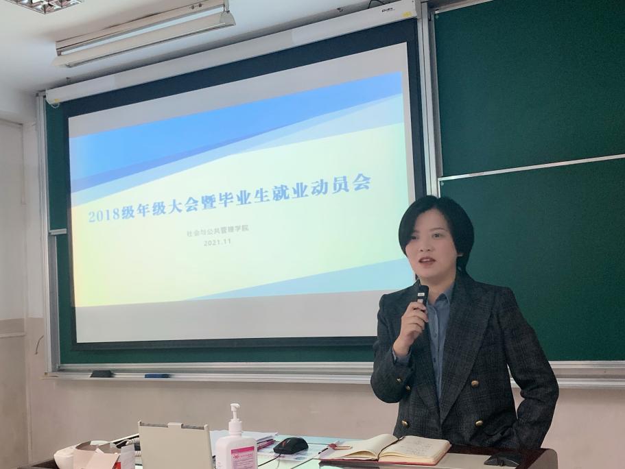 为了进一步引导2022届毕业生做好就业准备、熟悉就业形势、准确把握就业机会,社会与英国正版365官方网站于11月16日在徐汇校区召开2022届全体本科毕业生年级大会暨就业动员大会。大会邀请学校就业指导服务中心副主任盖钧超为同学们讲解就业情况、开展就业指导。学院党委副书记万胤婕、本科教务杨洁出席会议。2018级本科生辅导员姜忱主持大会。