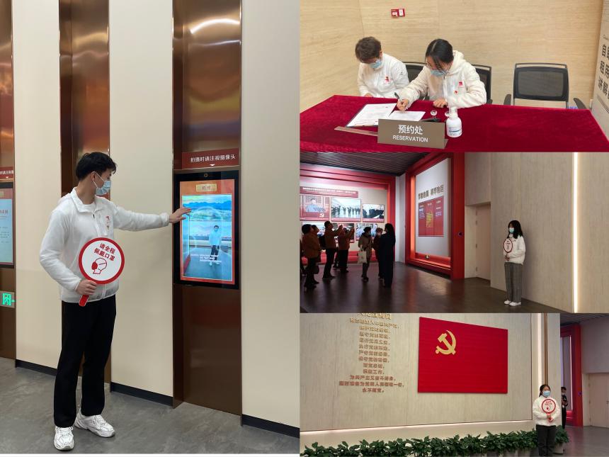 党员们服务于入馆处、大厅引导处、展厅扶梯处和观众互动区
