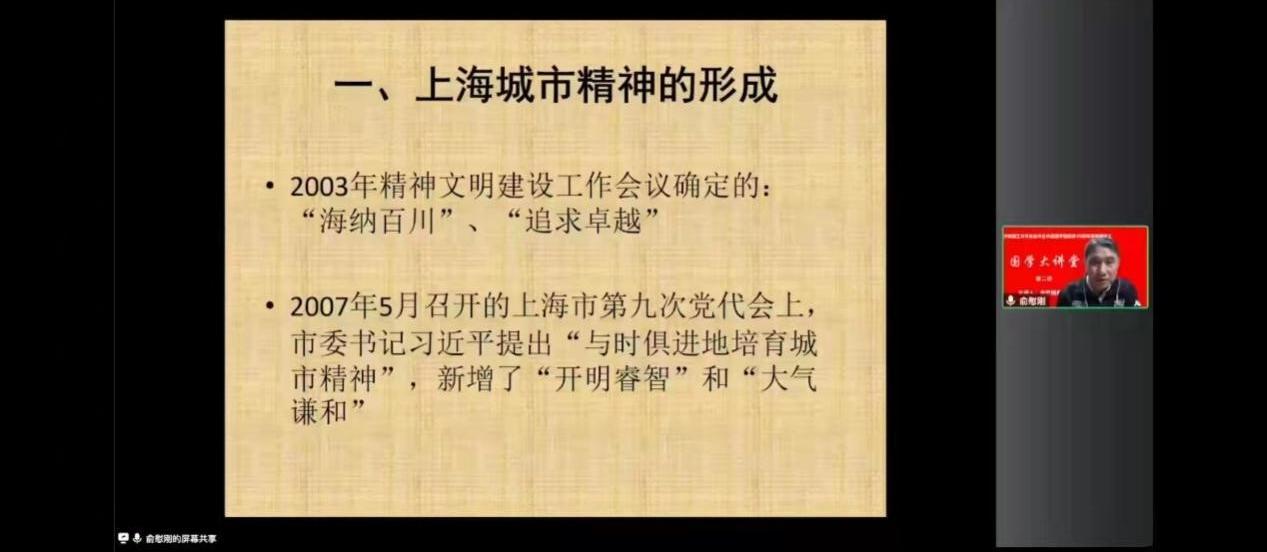 社会与英国正版365官方网站迎接校庆70周年系列活动之“国学大讲堂”文化讲座的第二场讲座近日圆满结束。本系列活动旨在充实学生们在疫情防控期间的学习生活,鼓励同学们感悟国学魅力、积淀文化知识、提升人文素养。第二场讲座由九三学社上海市委员会社史与理论研究工作委员会副主任、上海市行政管理学会常务理事俞慰刚教授主讲,他以“上海下海 海纳百川——从上海的形成看上海精神”为题,向参与讲座的师生溯源上海的城市精神的形成历程。