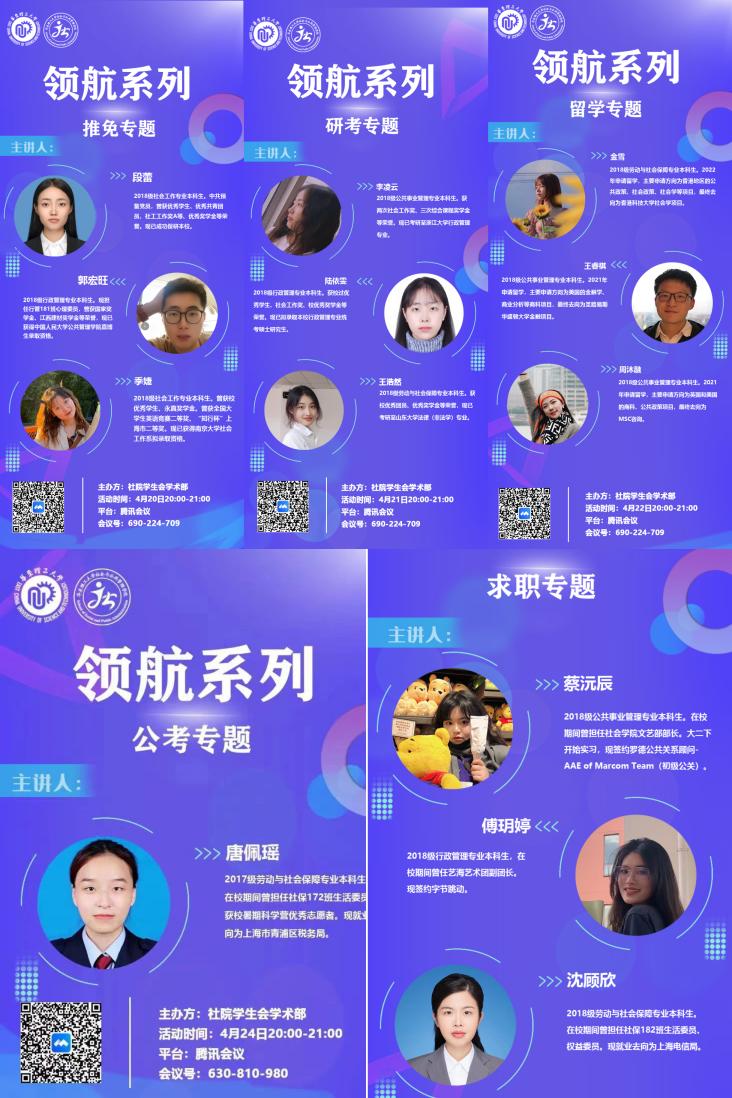 为了帮助本科生清晰自我定位,合理规划未来发展路径,了解升学、就业的相关知识,拓宽相关信息来源的渠道,为同学们进行答疑解惑,助力成才发展,社会与英国正版365官方网站于4月21日至4月25日连续举办五场发展领航系列经验交流分享会,分为研究生推免、考研、留学、求职及公务员考试五个分会场,五场在线参与人次累计超过2000人次,聆听朋辈经验,助力梦想启航。