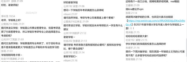 丰富的内容、详细的讲解让参与的同学们受益匪浅。留学专场的分享嘉宾金雪同学表示很高兴能与学弟学妹们分享自己的经验,也很乐意帮助有留学意愿的学弟学妹们答疑解惑。参与保研专场讲座的高嘉恬同学提到,几位学长学姐将保研过程中夏令营、预推免、正式推免中的注意事项和操作技巧倾囊相授,使她在保研这条路上少了些迷茫、多了些坚定,受益良多;参加考研专场的胡冰晗同学则表示通过学长学姐们的经验分享,使她更加深入了解了关于考研的院校选择、专业选择与复习规划的相关优秀经验,对她在考研学习时间分配、专业课学习大有帮助。