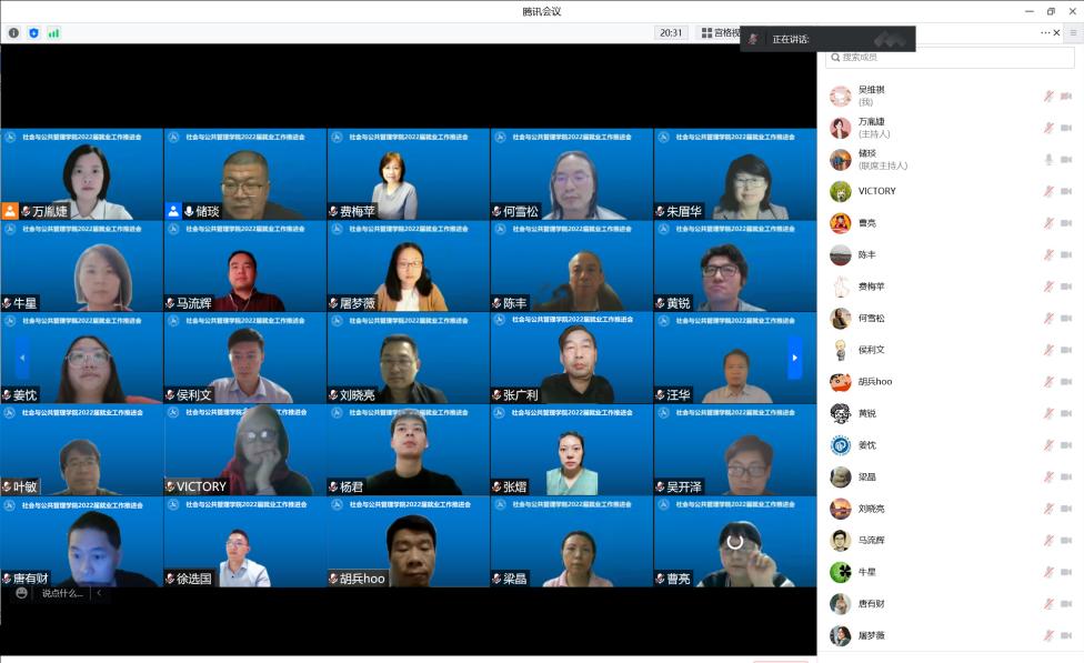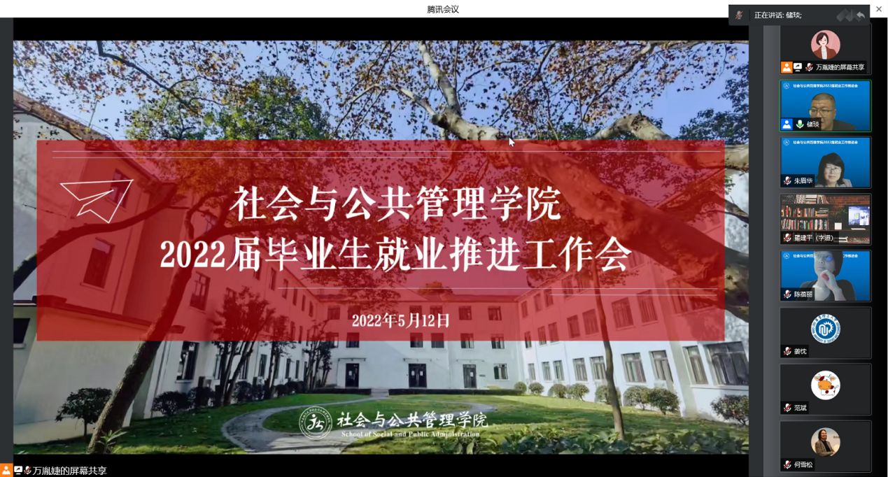 为全力以赴做好应对疫情稳就业工作,5月13日,社会与英国正版365官方网站召开2022届毕业生就业工作推进会,学院党政联席会成员、各系正副系主任、待就业研究生导师、毕业班班导师、本研毕业班辅导员参加线上工作会。会议由学院党委副书记储琰主持。