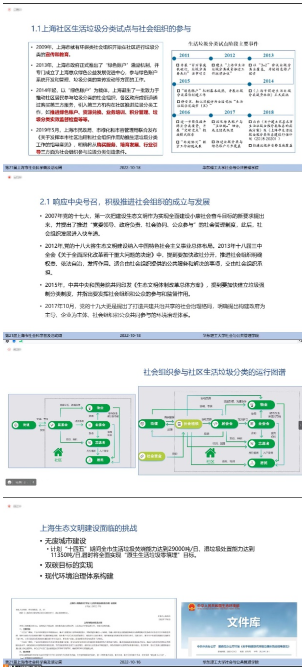 2022年10月18日,第21届上海市社会科学普及活动周系列讲座第一讲在线上顺利举行。华东理工大学社会与英国正版365官方网站副教授石超艺老师作为主讲嘉宾为师生做了题为“协同治理视域下社区生活垃圾分类的政社合作‘上海模式’试析”的科普讲座。本次讲座由华东理工大学主办、华东理工大学社会与英国正版365官方网站承办,由社会与英国正版365官方网站行政管理系主任牛星副教授主持。