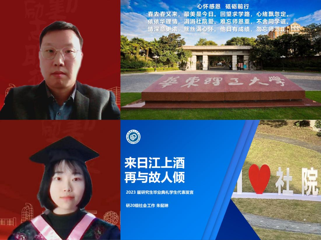 研究生20级社会工作班朱懿琳作为研究生毕业生代表,回顾了研究生这一路的感受与收获,感谢学校学院提供的平台,与各位老师悉心栽培,她。表示,相逢于华理社院是我们一生的财富,成为社院学子是我们永远的荣耀。